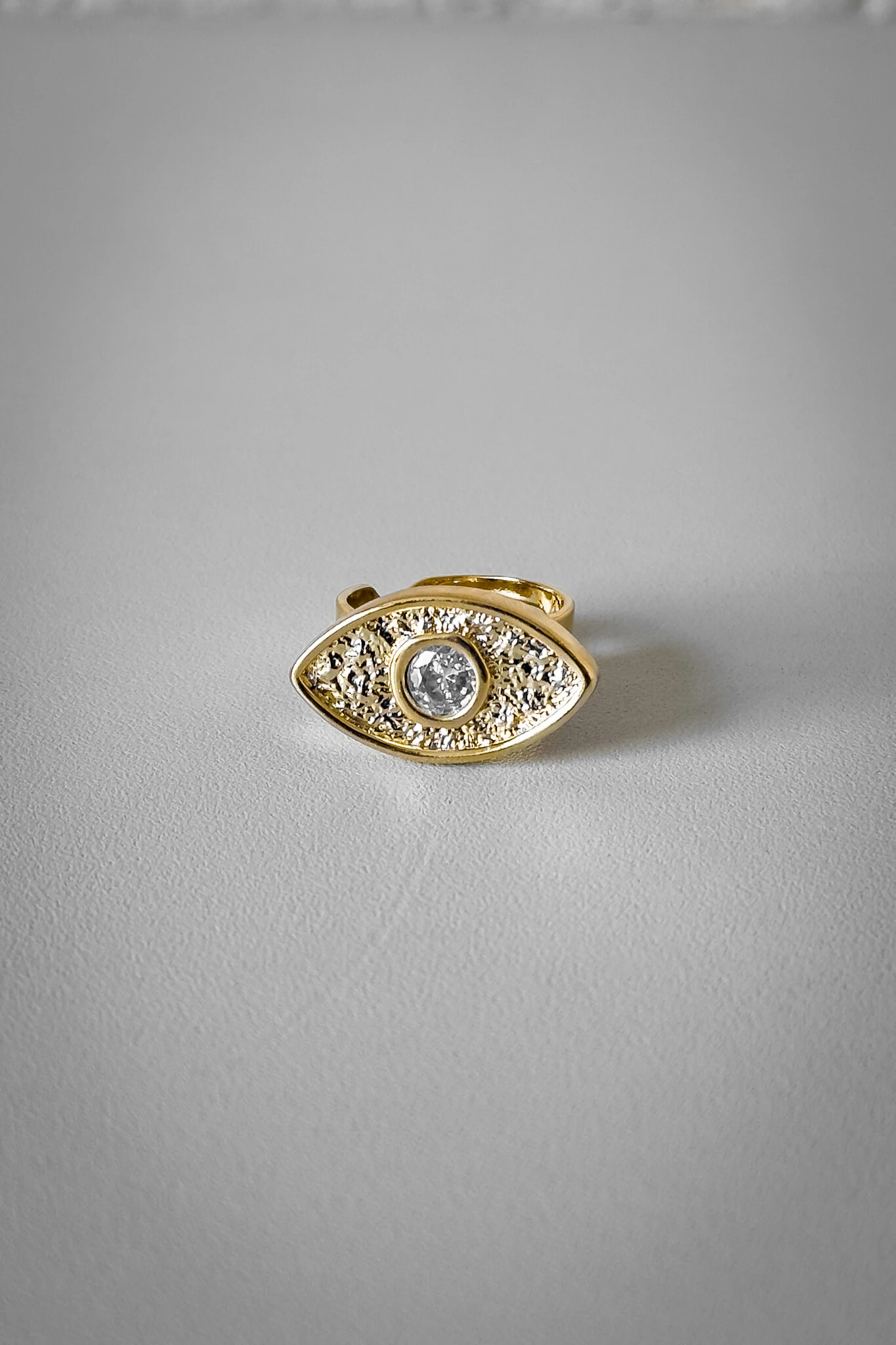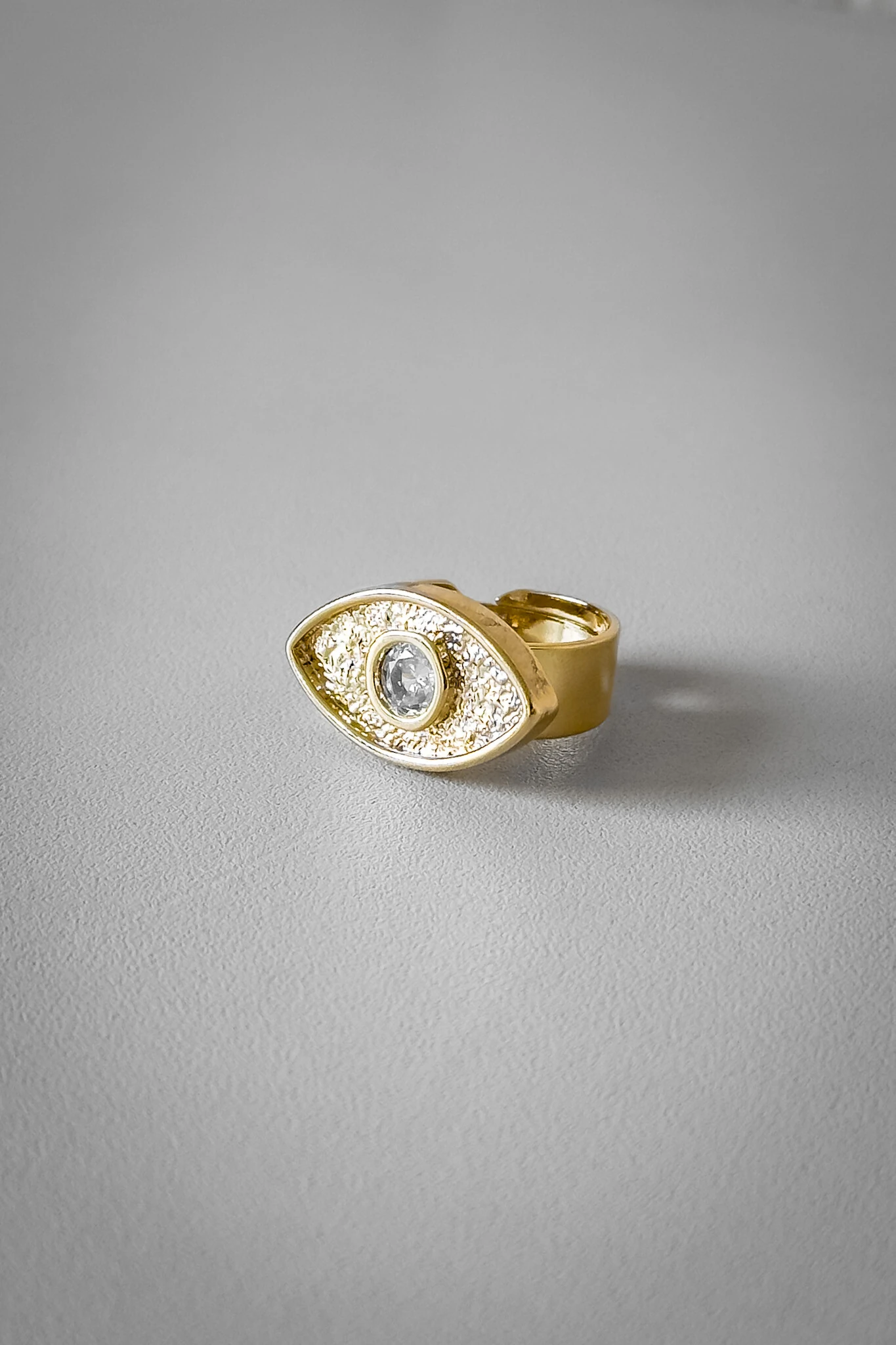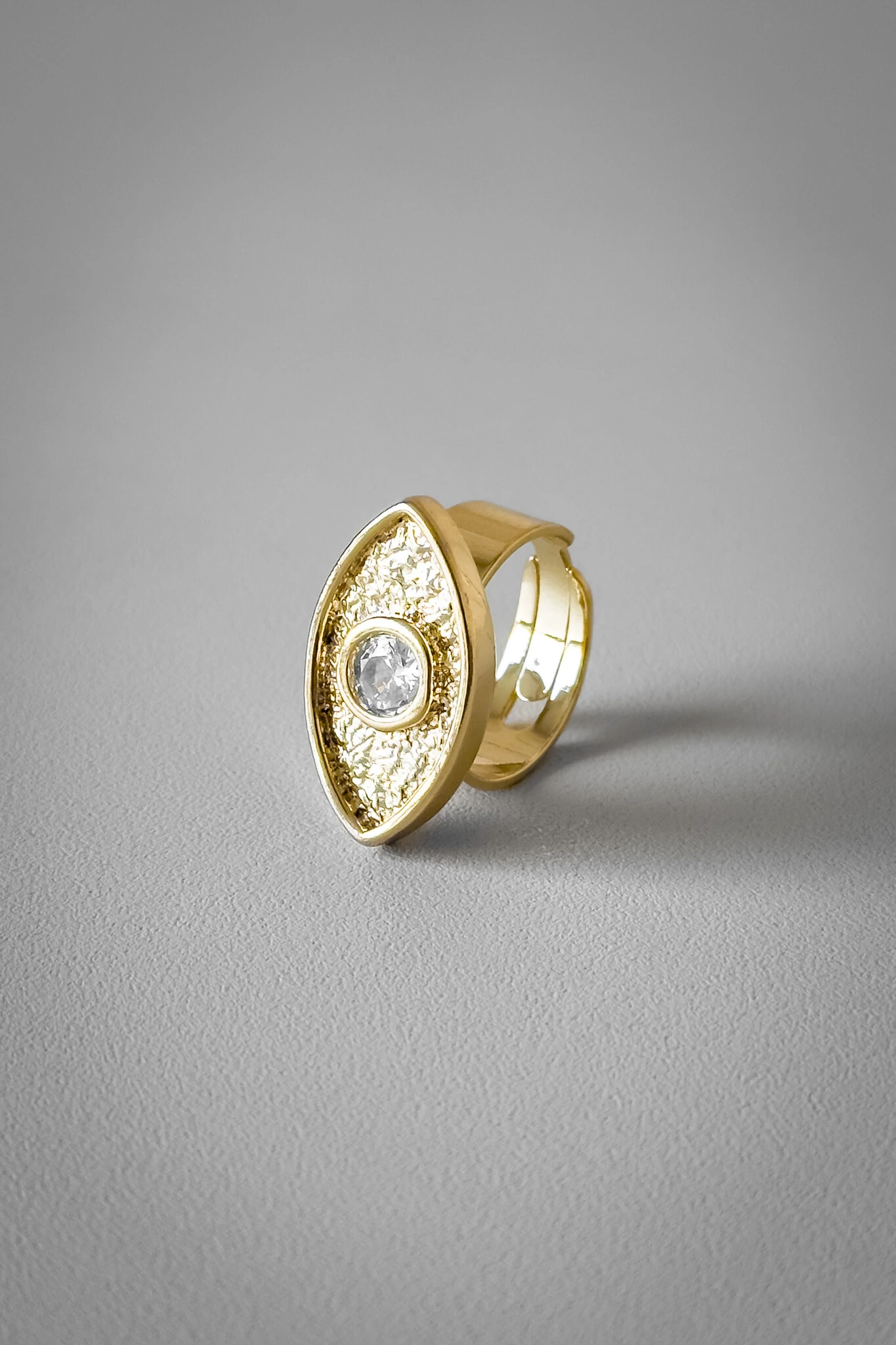 O Anel Olho Ajustável | Banho de Ouro 18k | Sofisticado é uma peça que une proteção simbólica e muito estilo. Seu design em formato de olho com pedra central brilhante traz um toque moderno e cheio de personalidade, perfeito para destacar sua essência em qualquer ocasião.