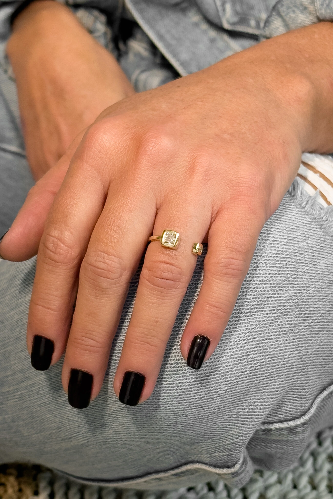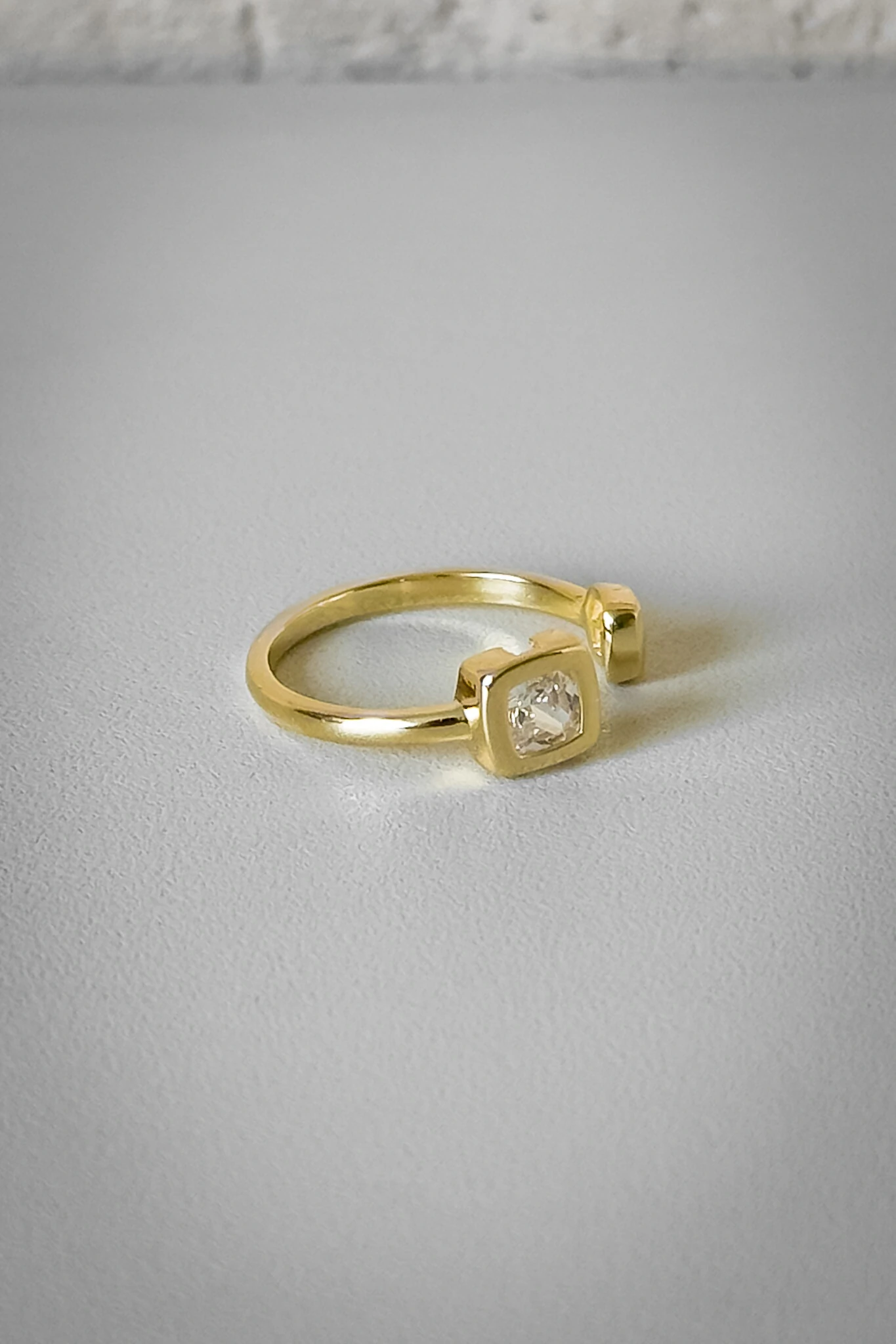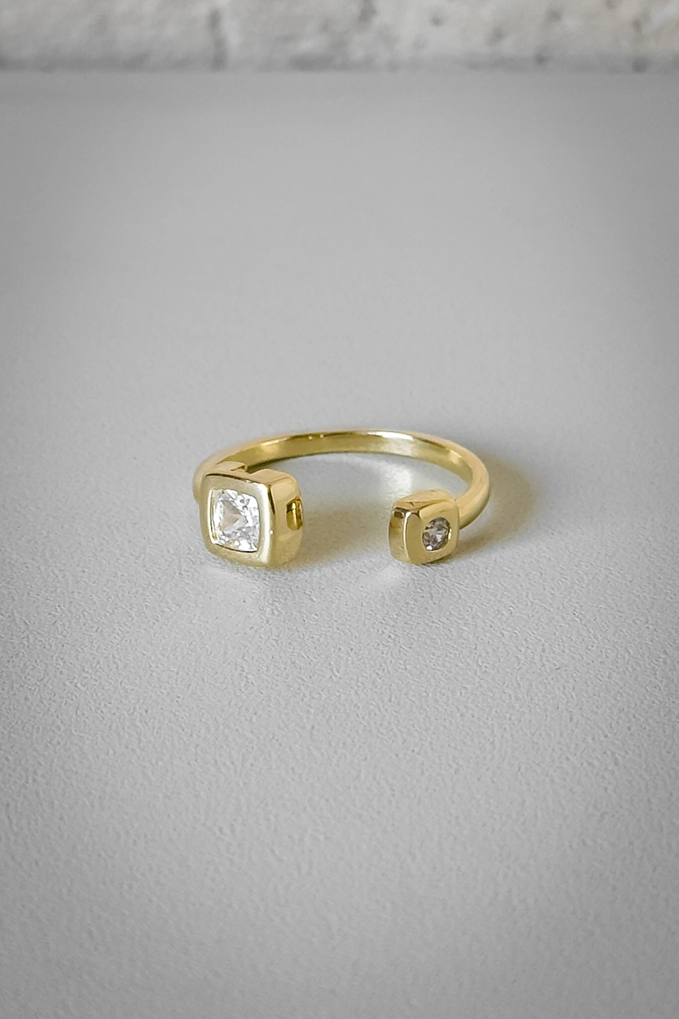 O Anel Duo Quadrado Cravejado é a peça perfeita para quem busca sofisticação e modernidade em um só design. Com estrutura aberta e duas zircônias em lapidação quadrada, este anel em banho de ouro 18k é ideal para transmitir elegância de forma descomplicada.