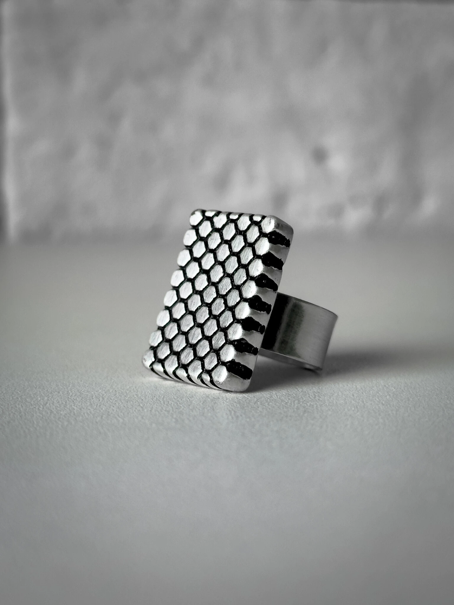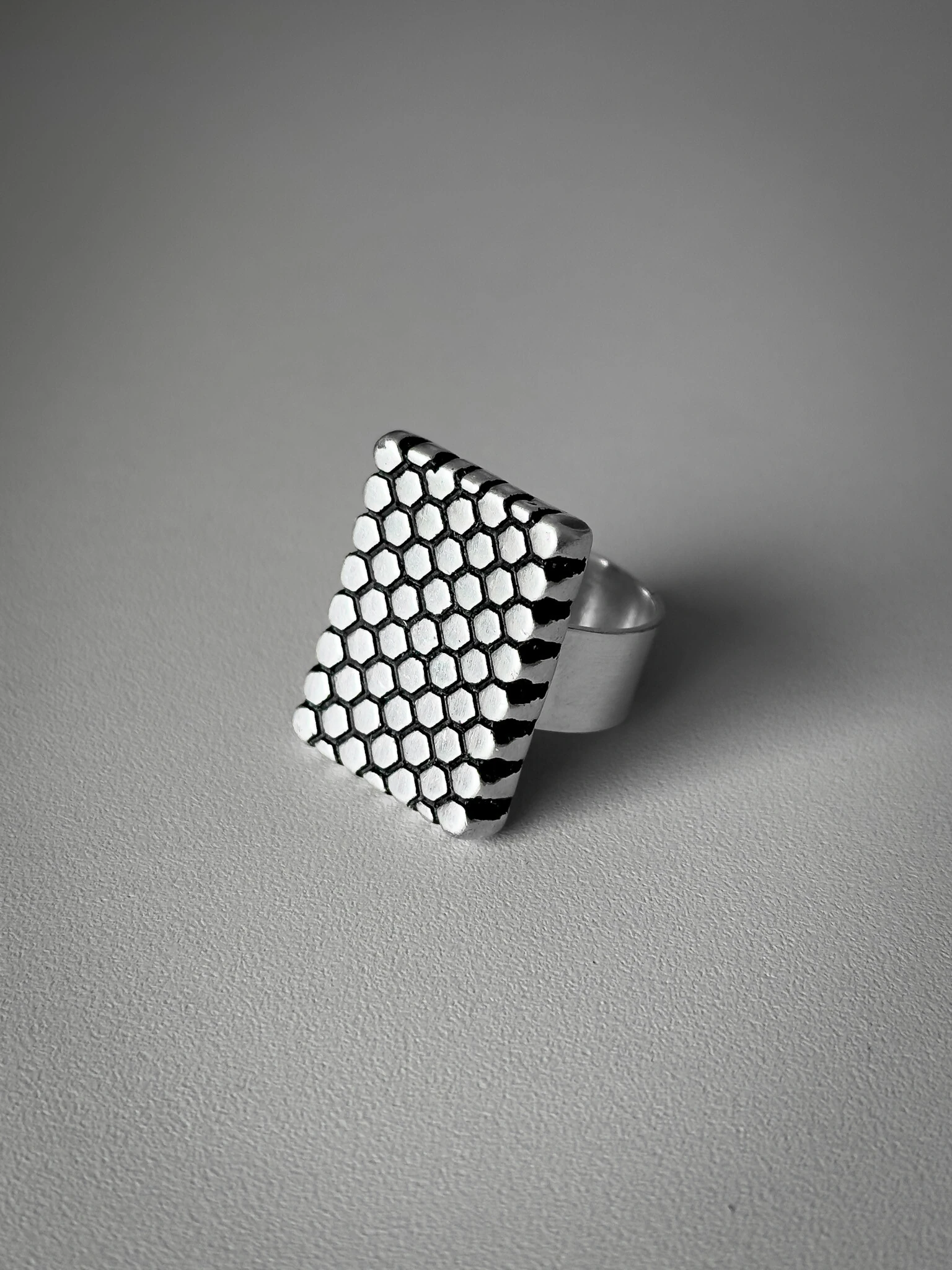 O anel Retangular Colmeia da Tatsi é o equilíbrio perfeito entre modernidade e originalidade. Com formato geométrico marcante e textura em alto-relevo que lembra uma colmeia de abelhas, essa peça com banho de prata 925 é ideal para compor looks com atitude.