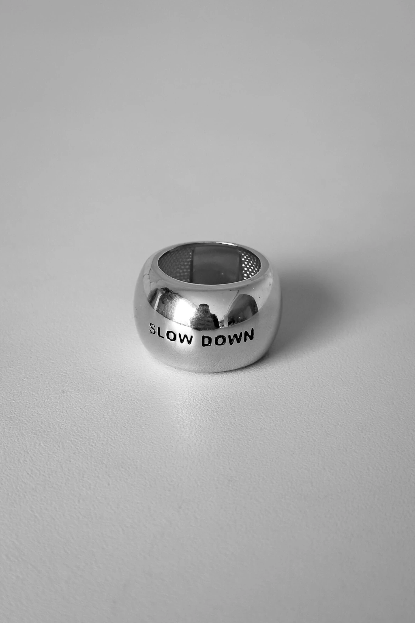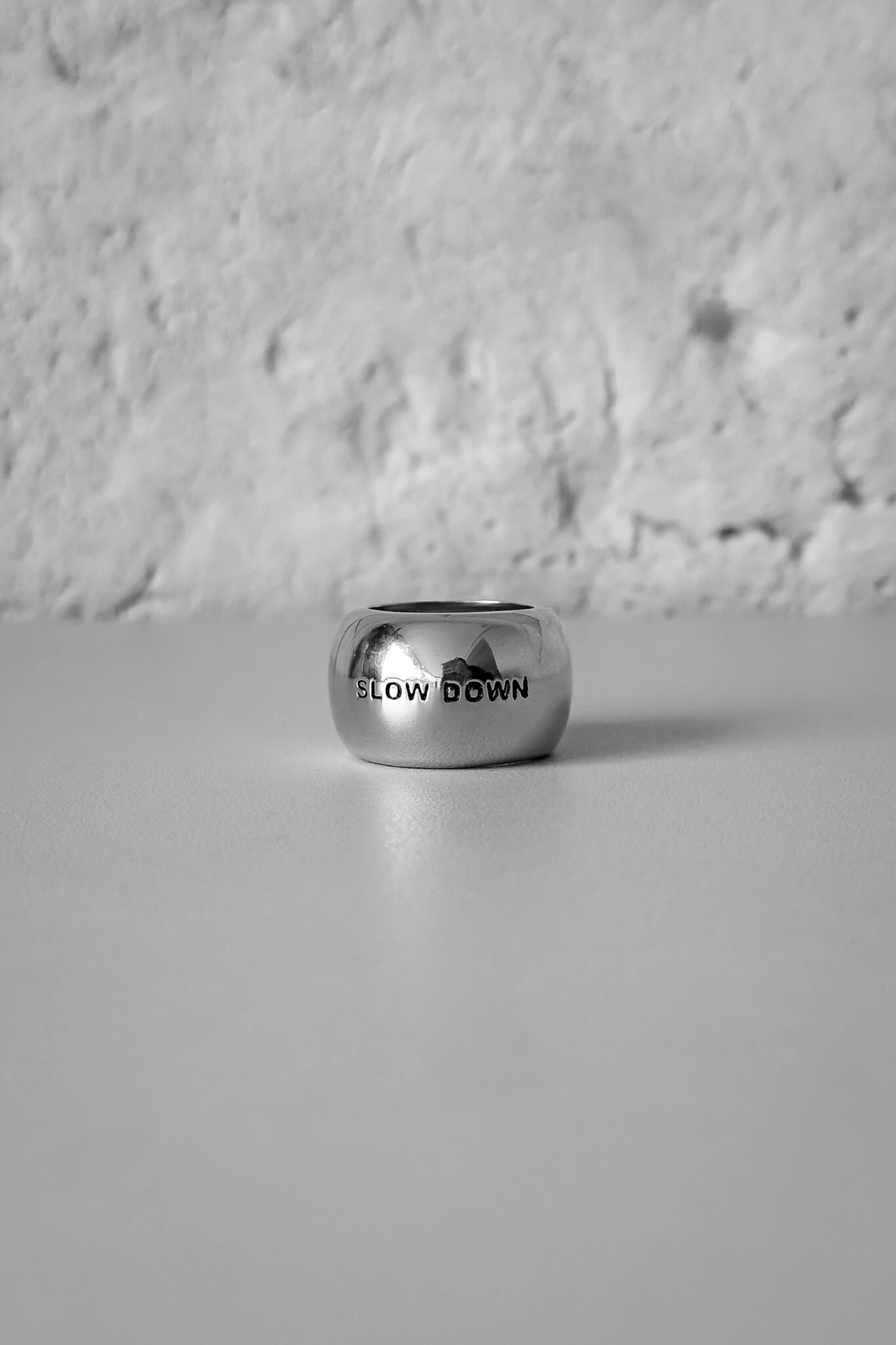 O Anel Bold Slow Down em Banho Ródio é um statement piece — moderno, marcante e cheio de personalidade. Seu design bold, com volume elegante e acabamento espelhado, destaca a gravação SLOW DOWN, um lembrete sutil para desacelerar e viver com mais presença.