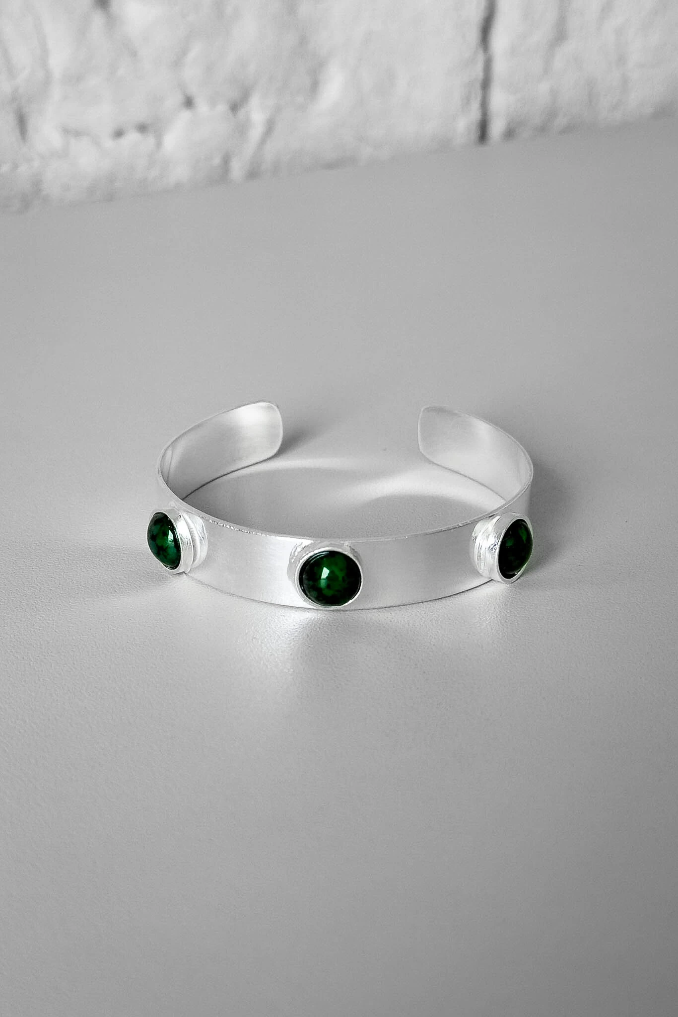 Seu design ajustável, com estrutura lisa e acabamento polido, valoriza as extremidades adornadas por pedras verdes que refletem sofisticação e frescor.