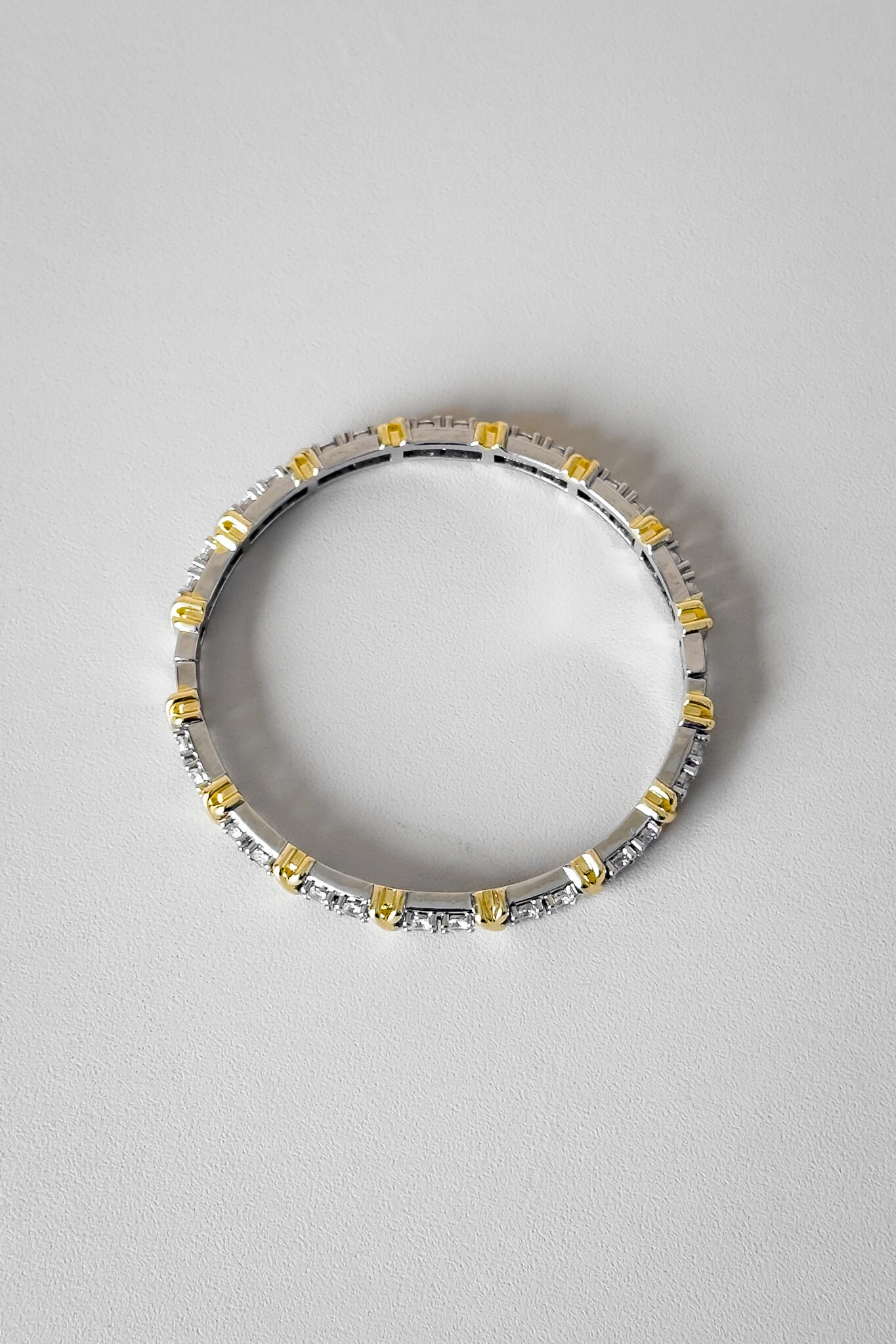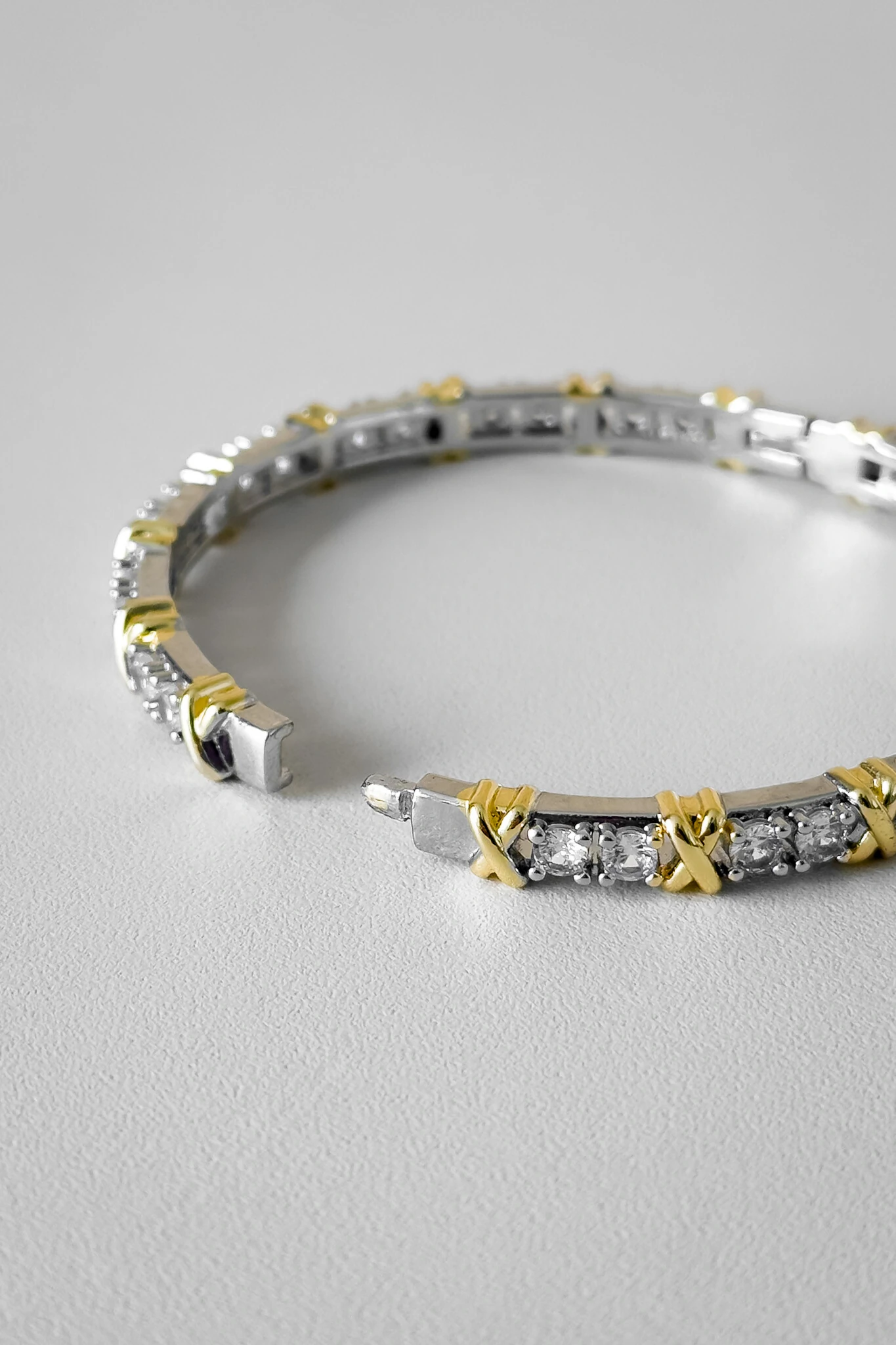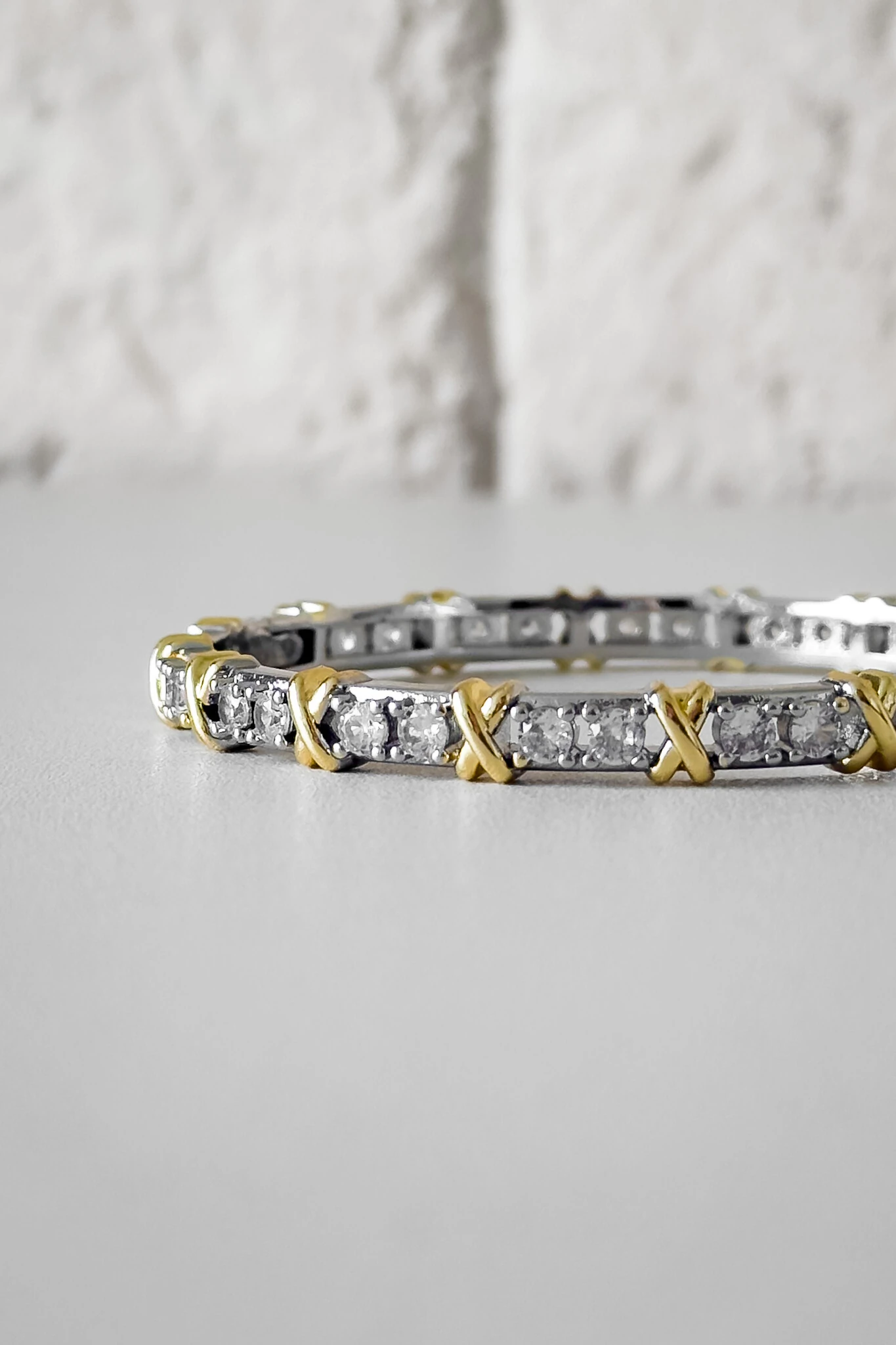 O Bracelete Cravejado X Duo em Banho Ródio e Ouro 18k é uma joia que une sofisticação e brilho em cada detalhe. Seu design bicolor é enriquecido por fileiras de zircônias lapidadas e delicados detalhes em “X” dourados, criando um contraste elegante e luxuoso. Uma peça perfeita para compor produções modernas e refinadas.
