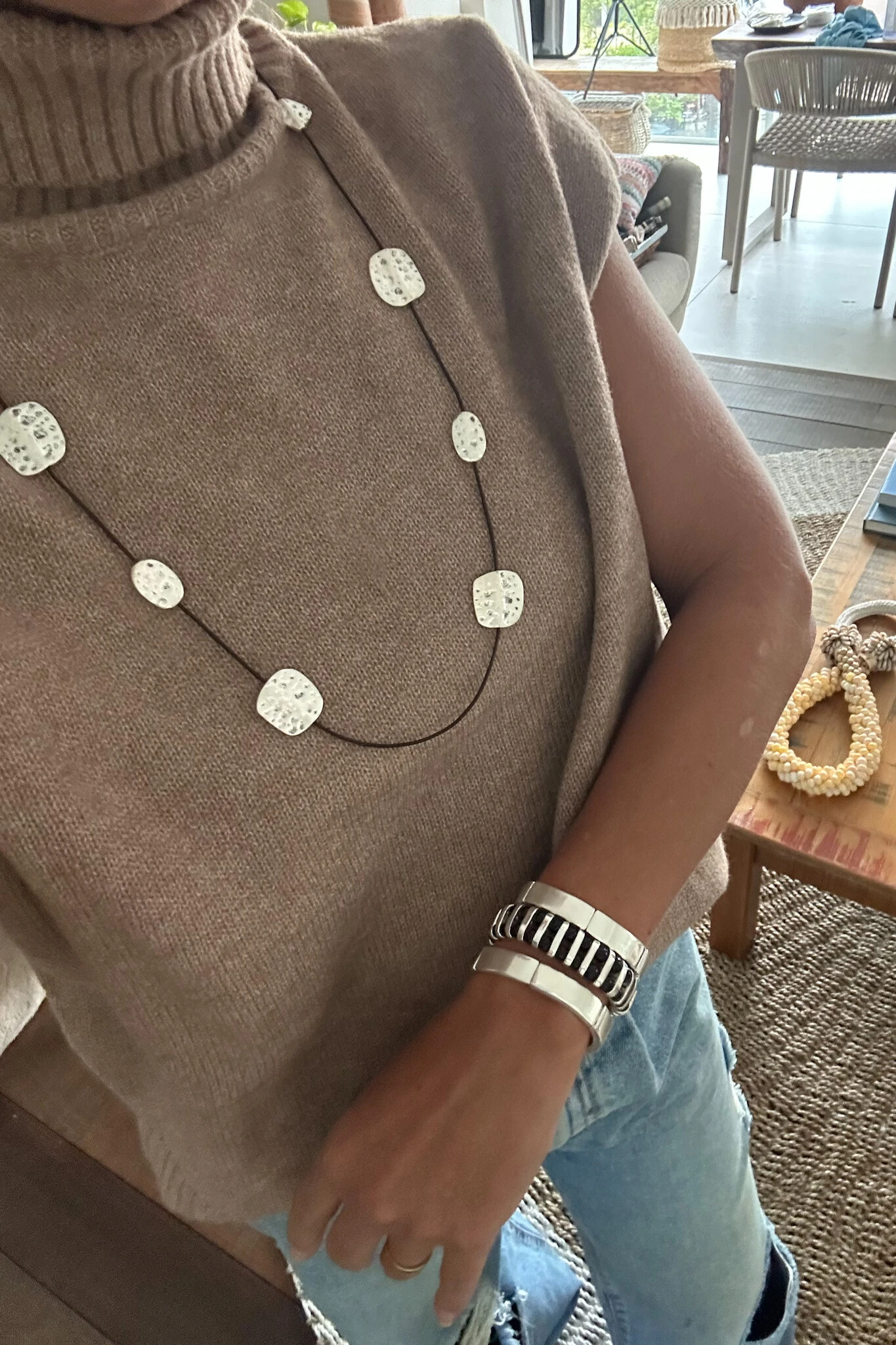 O Colar Couro com Placas Marteladas | Banho de Prata 925 | Moderno é uma peça marcante que une o charme rústico do couro ao brilho sofisticado da prata. Composto por tiras de couro e placas de formato orgânico com acabamento martelado, banhadas em prata 925, este colar é perfeito para quem busca um acessório contemporâneo e versátil.