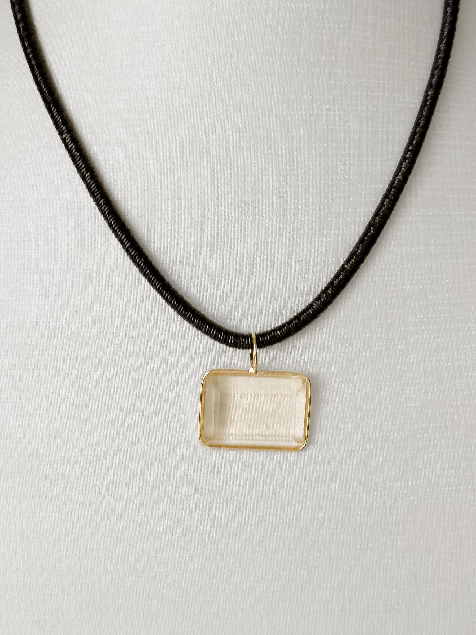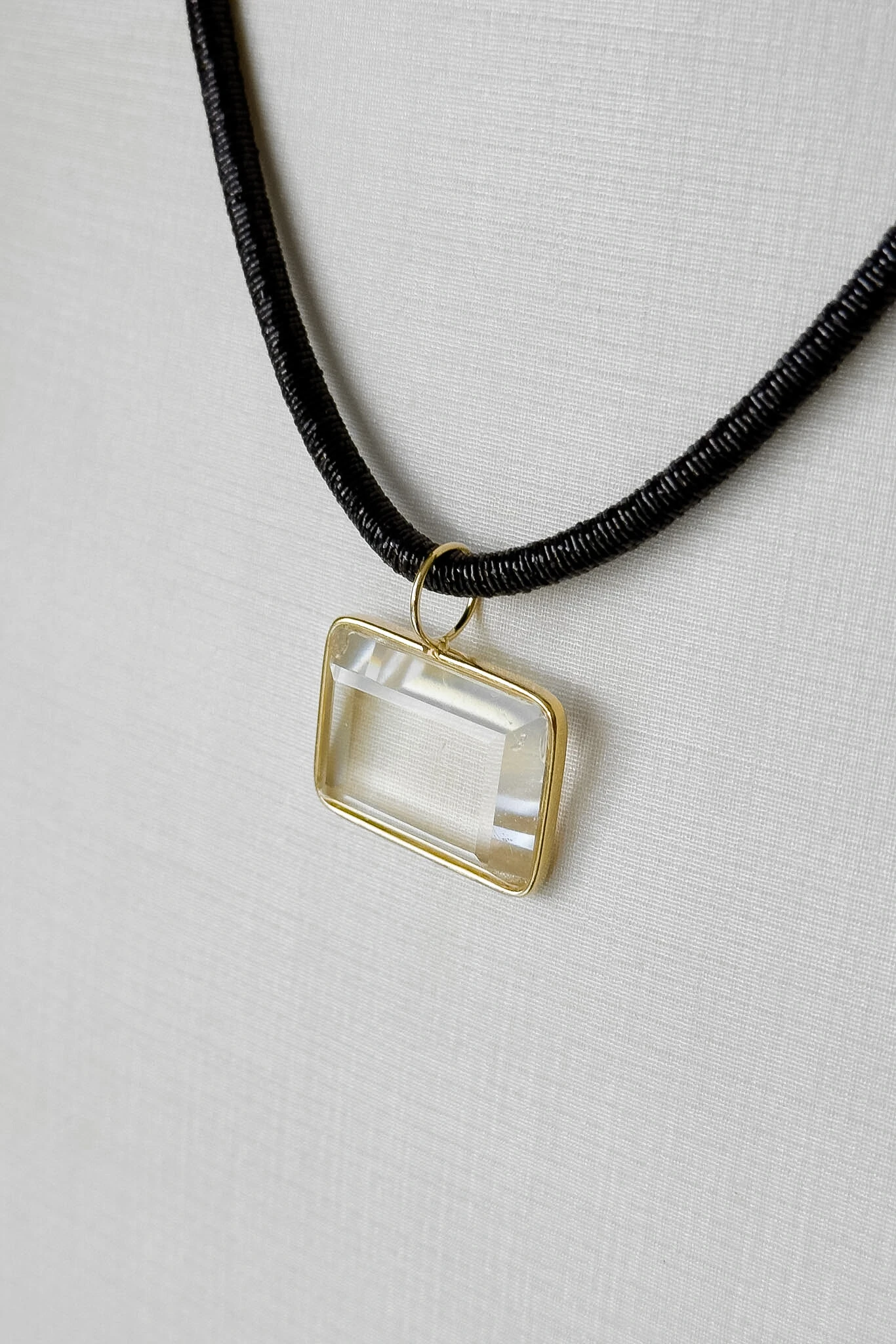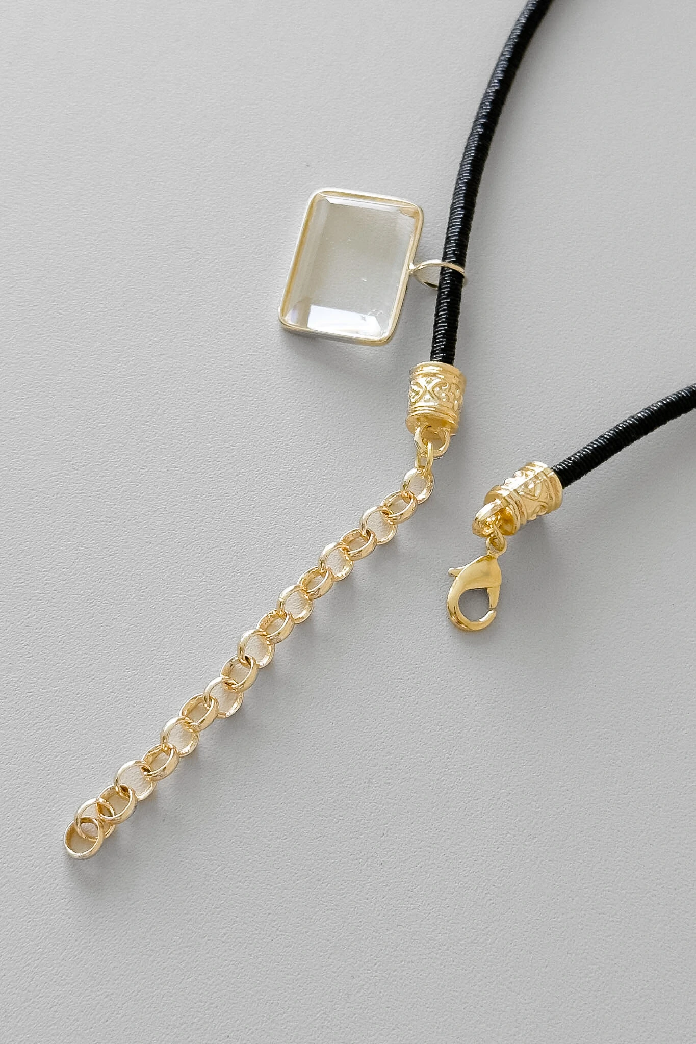 Seu cordão de couro oferece um visual contemporâneo e leve, enquanto o pingente de resina transparente adiciona um toque artístico e sofisticado ao look.