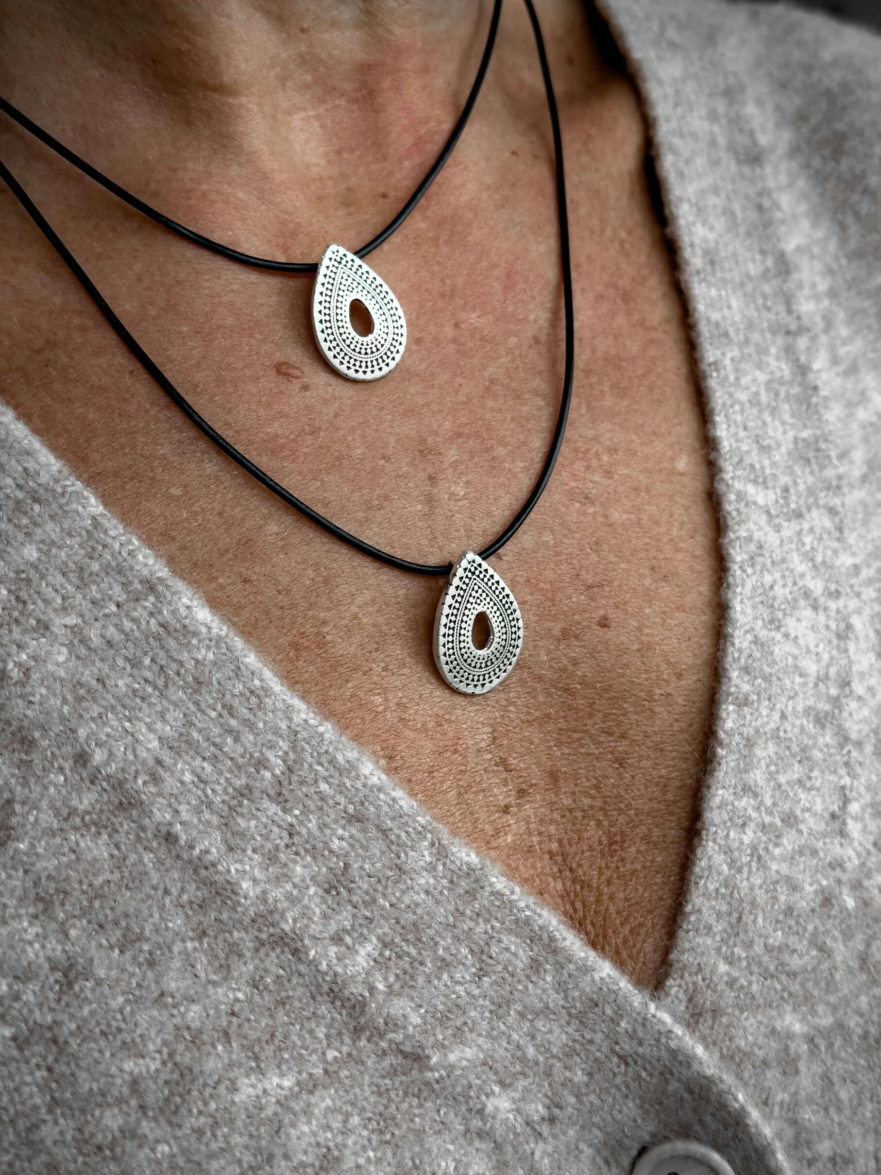Colar Duplo Gota Tribal | Banho de Prata 925 | Couro Preto