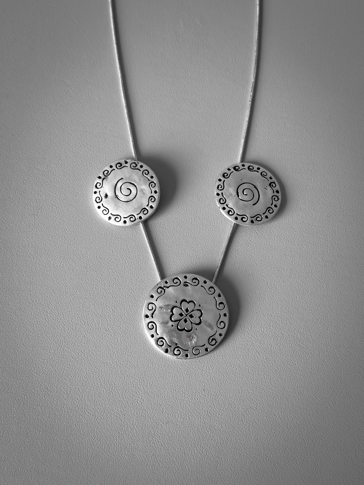 Com três medalhas redondas gravadas com símbolos tribais e florais, este colar com banho de prata 925 é a escolha ideal para quem ama peças únicas e com alma. O acabamento artesanal e o estilo boho tornam a peça perfeita para usar com vestidos leves, camisas soltas ou até mesmo em sobreposições mais urbanas.