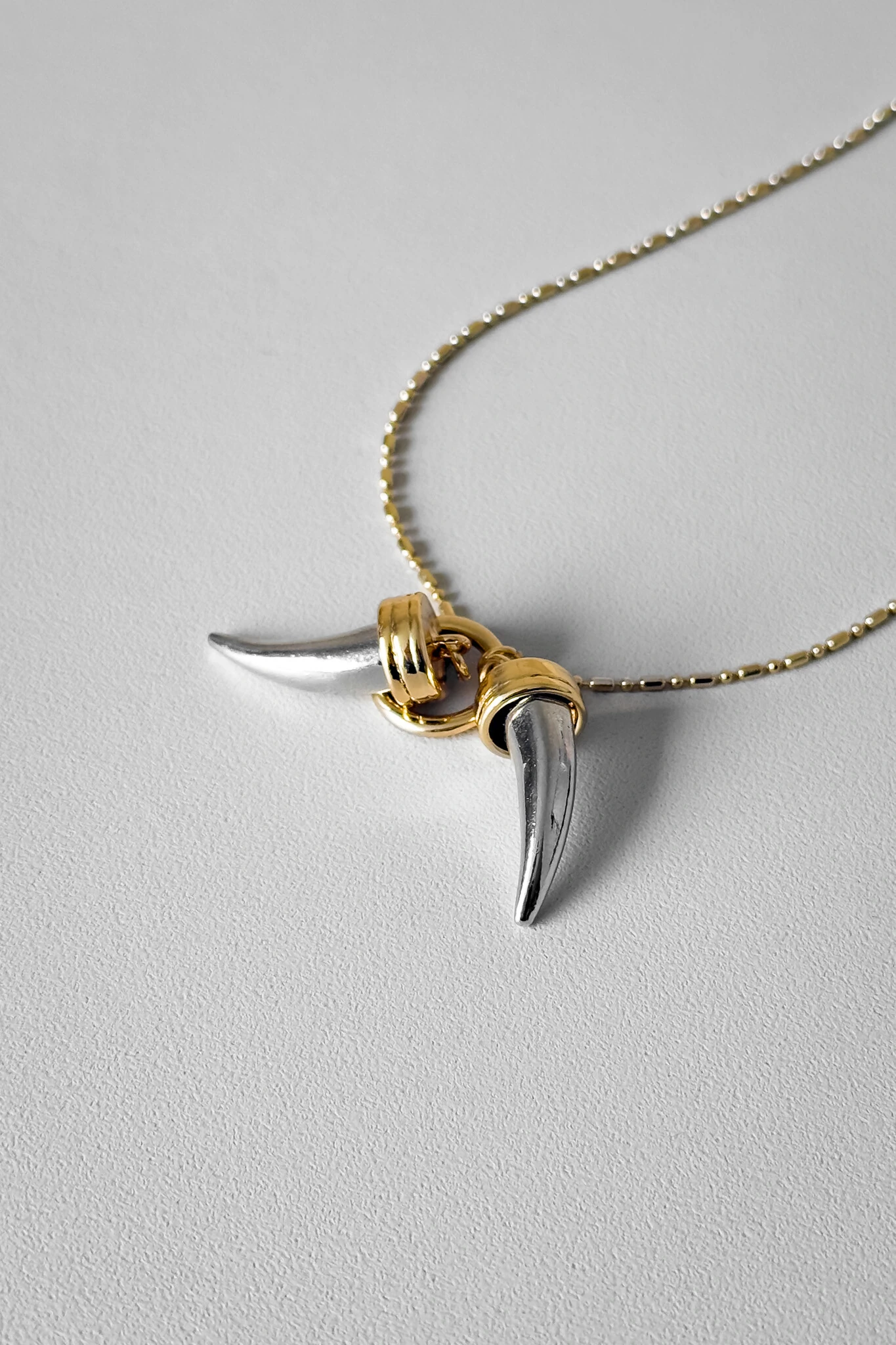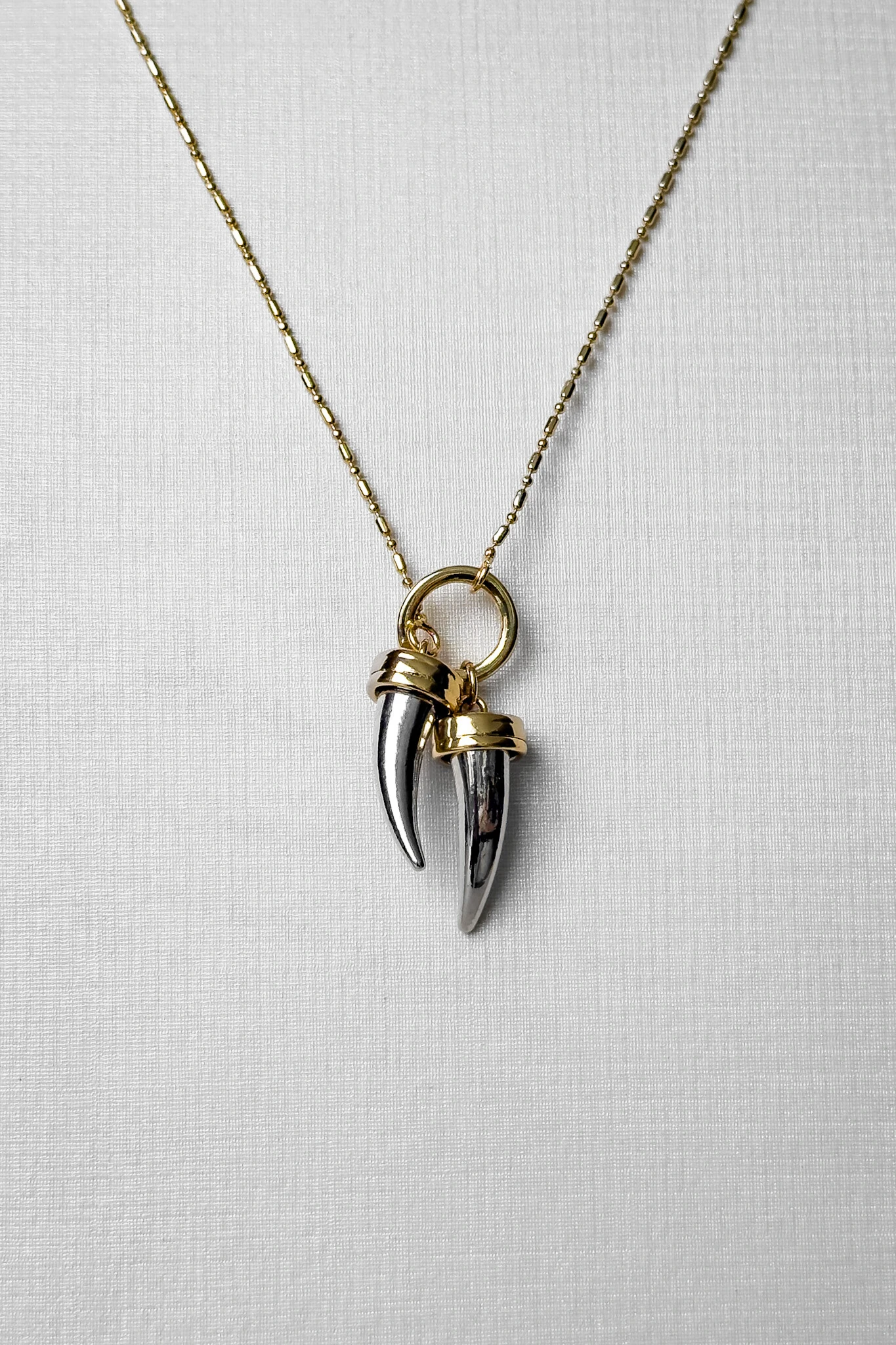Com design moderno, a corrente dourada delicada sustenta dois pingentes de dentes prateados, criando um contraste sofisticado e atemporal.
