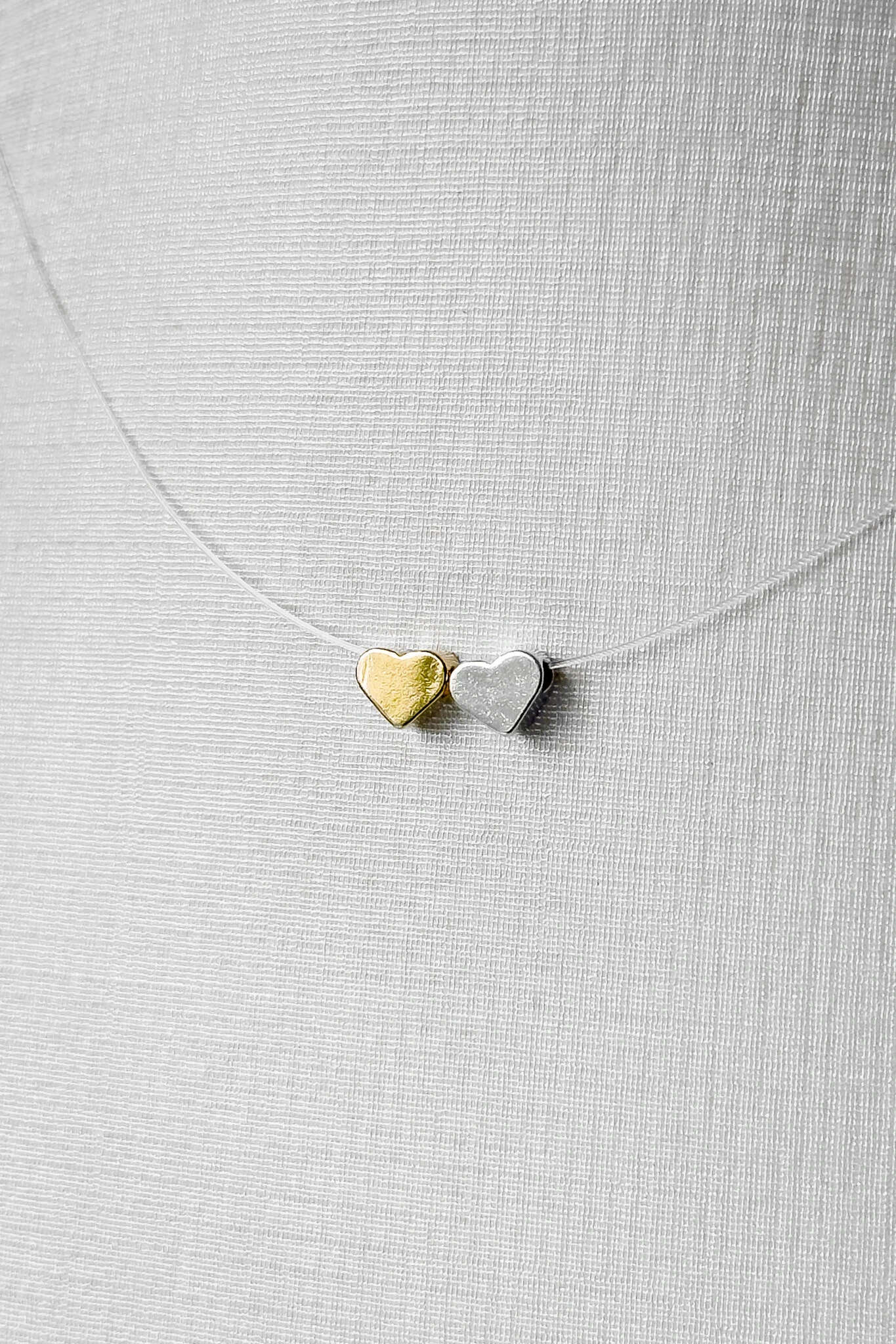 Com dois corações — um dourado e outro prateado — unidos em um fio de nylon quase invisível, a peça simboliza a união de duas energias: a força e a ternura, o sol e a lua, o brilho e a leveza.