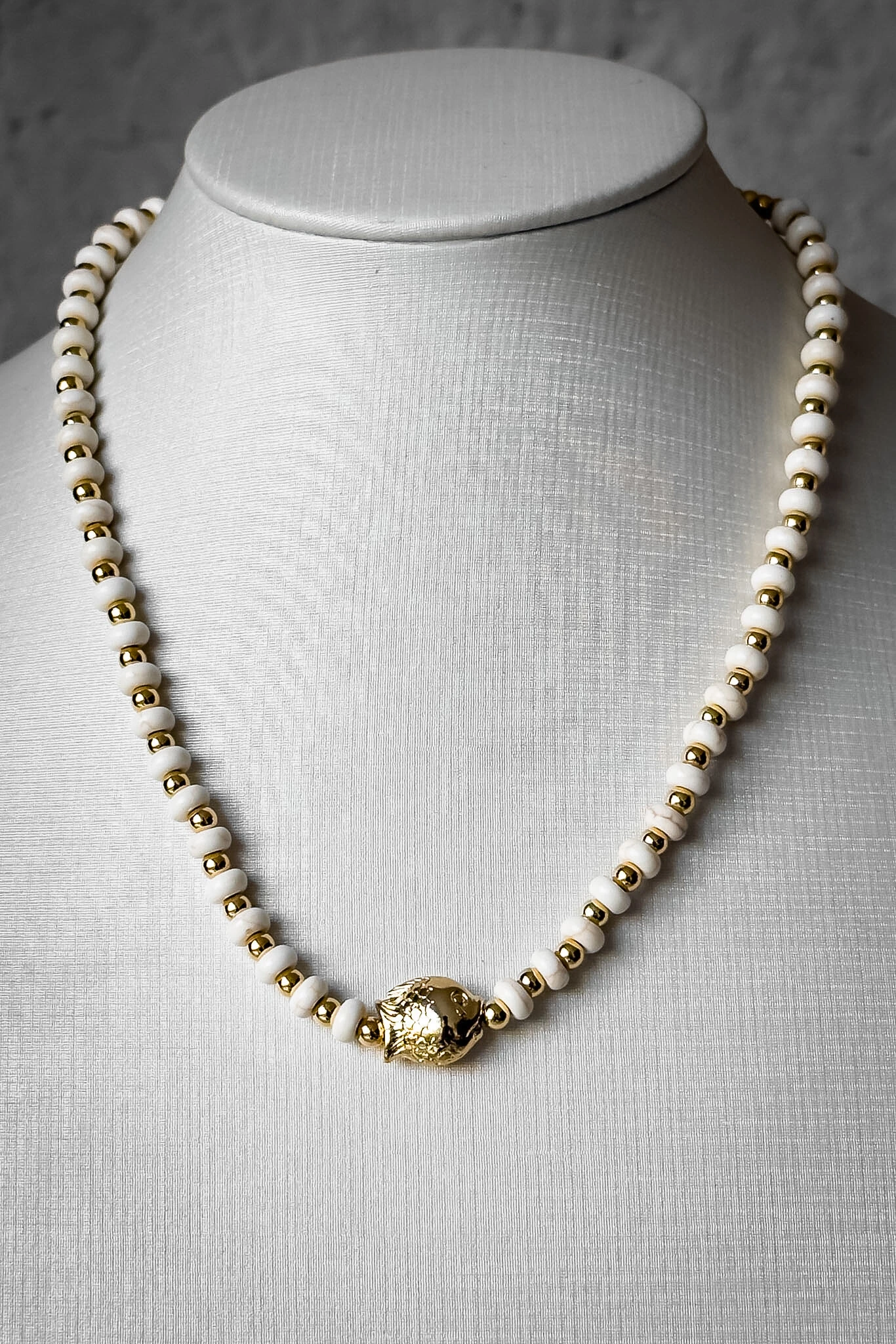 Seu design combina a delicadeza das pérolas intercaladas com elos dourados e um pingente exclusivo de peixe, trazendo movimento e sofisticação à peça. Para completar, um pequeno pingente de pérola ao lado adiciona ainda mais charme e autenticidade.