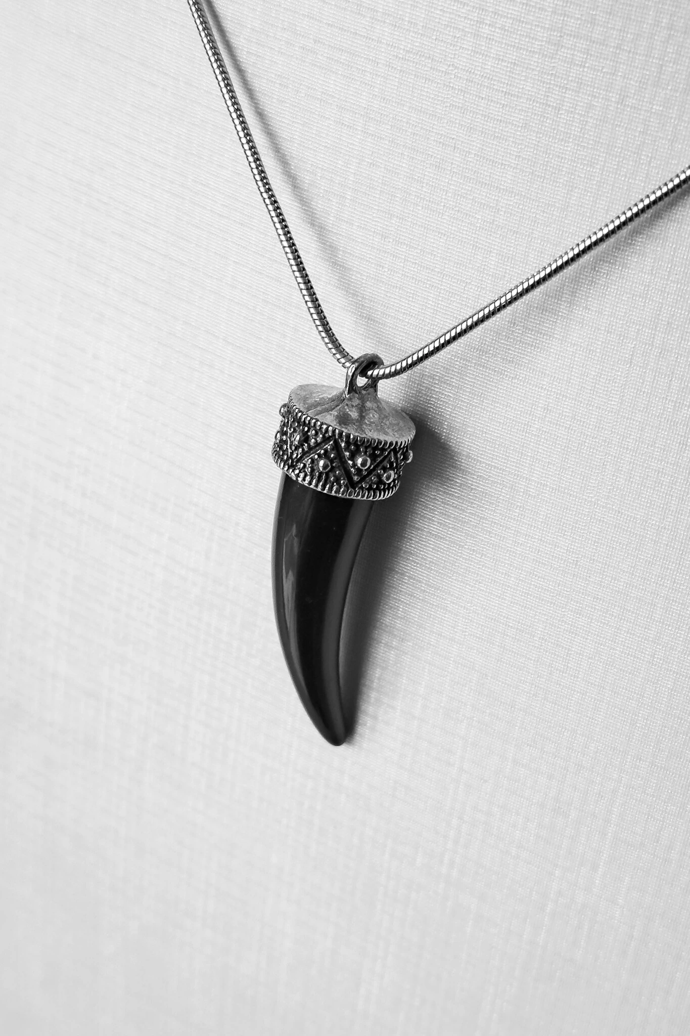 Seu pingente em formato de dente, com acabamento entalhado em metal detalhado, cria uma combinação moderna e poderosa. O contraste do preto com o brilho prateado do ródio transforma o colar em um acessório de destaque — perfeito para quem gosta de joias com personalidade.