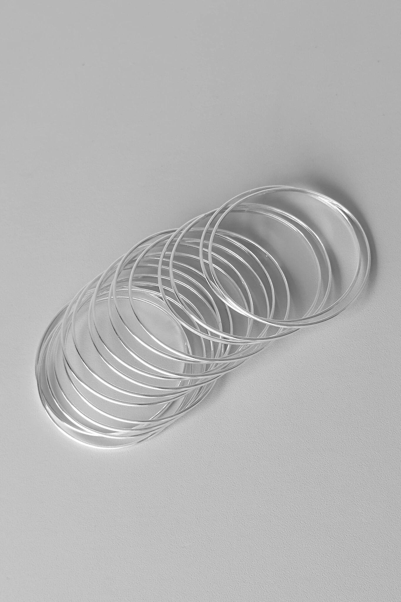 Confeccionadas em Prata 925 legítima, estas 15 argolas rígidas, quando usadas juntas, criam o desejado efeito de bracelete largo (visual de bracelete grosso ou cuff), cobrindo uma parte significativa do antebraço com um brilho espelhado espetacular e texturizado.