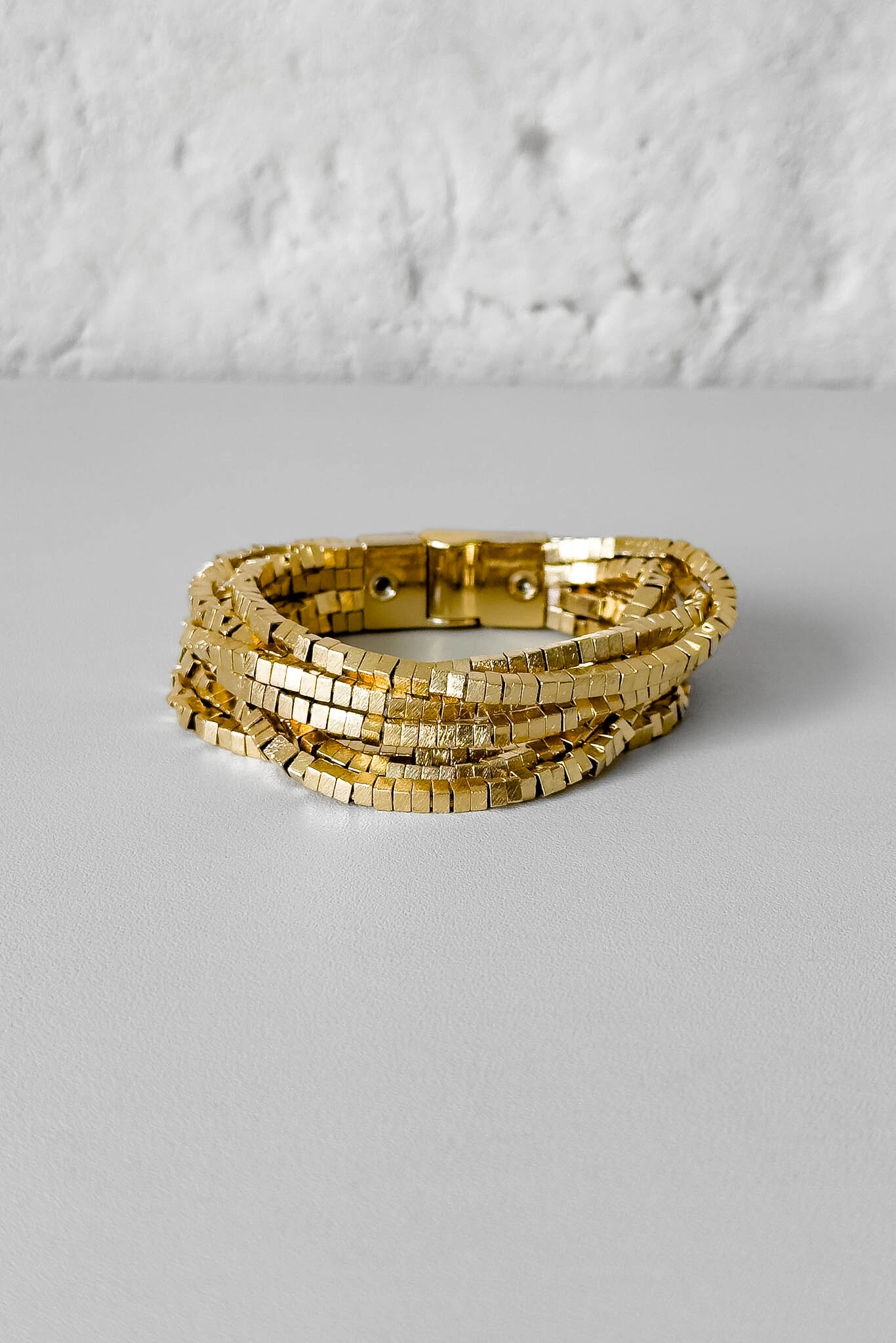 A Pulseira Fios Malha Cubinhos é perfeita para compor seu mix com peças Tatsi. Composta por 15 fios flexíveis de pequenos cubos metálicos, a peça envolve o pulso em múltiplas voltas, criando textura e movimento com acabamento dourado intenso. O fecho magnético oferece praticidade e encaixe seguro. Circunferência padrão de 18 cm, mas aceitamos encomendas em tamanhos menores ou maiores via WhatsApp.