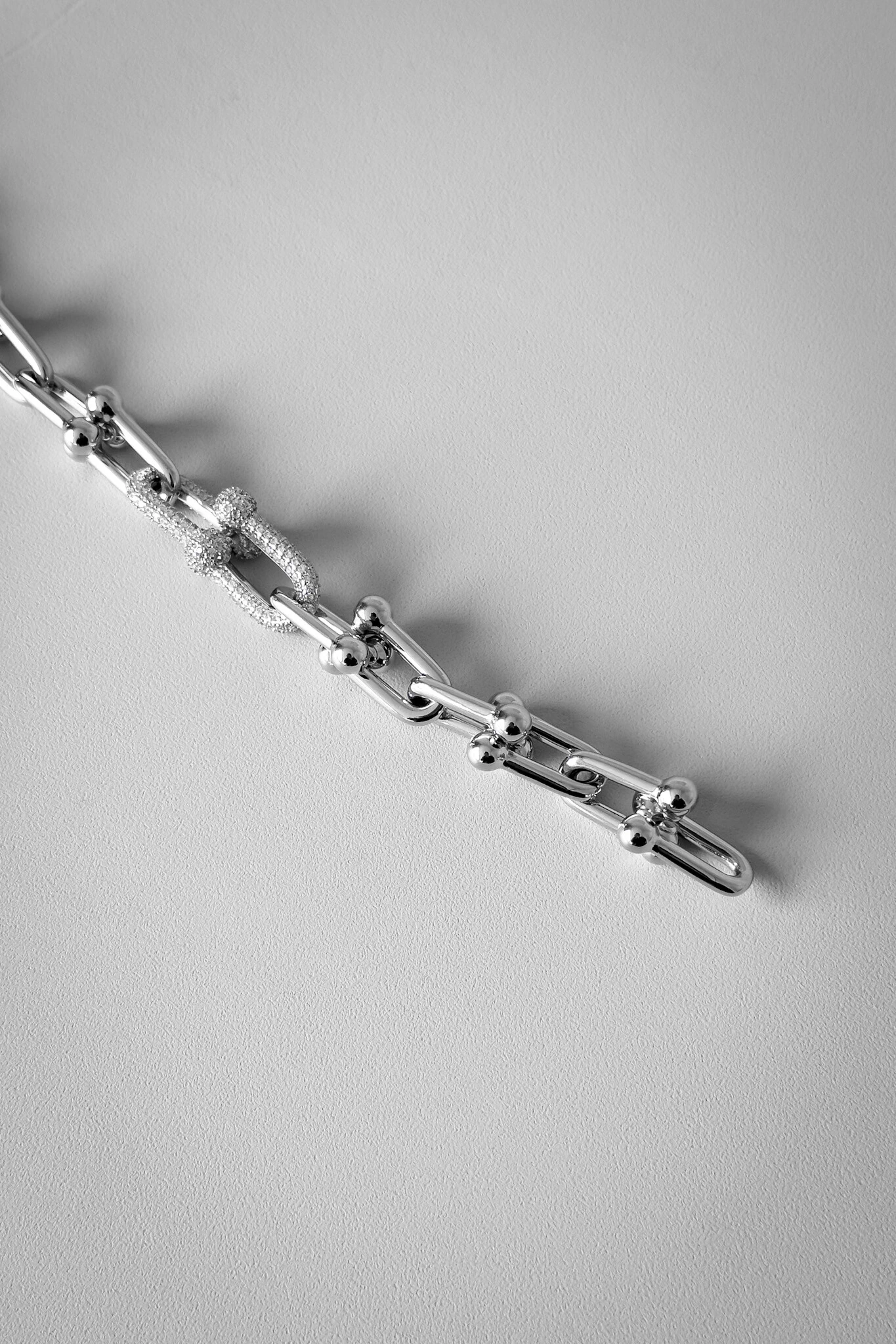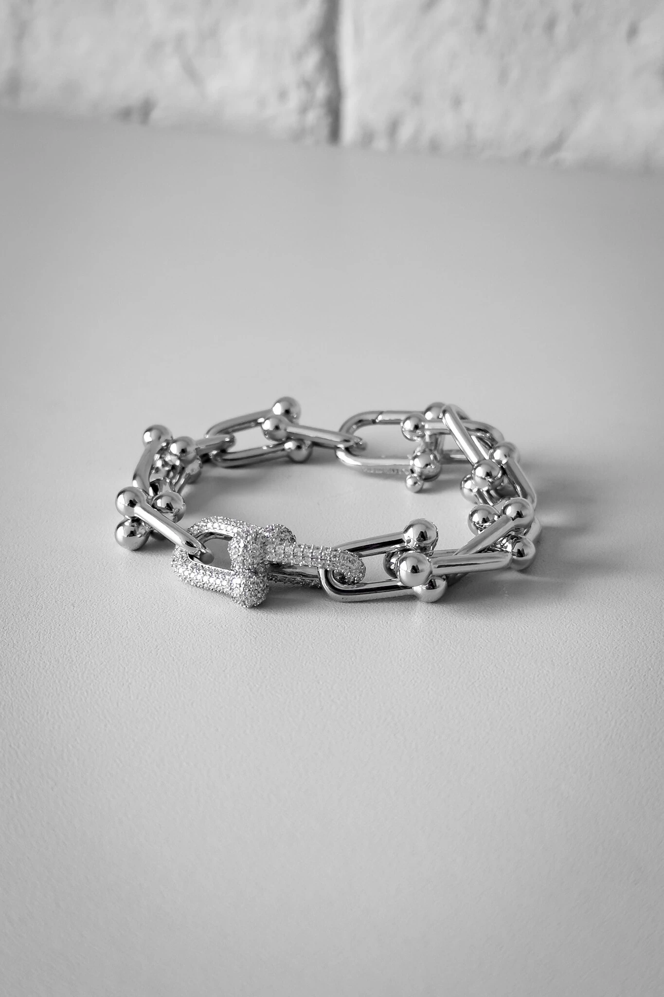 Esta pulseira de elos geométricos com banho de ródio é uma peça de impacto, unindo design moderno e brilho sofisticado. Os elos robustos recebem detalhes cravejados que trazem luminosidade e exclusividade à joia.