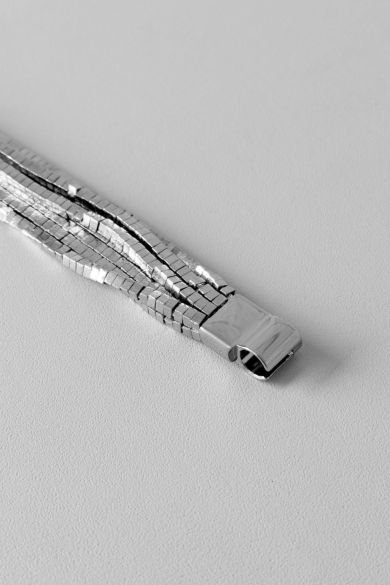 A Pulseira Fios Malha Cubinhos apresenta múltiplos fios flexíveis formados por pequenos cubos metálicos, criando textura e movimento com acabamento grafite brilhante — perfeita para compor seu mix com peças Tatsi.