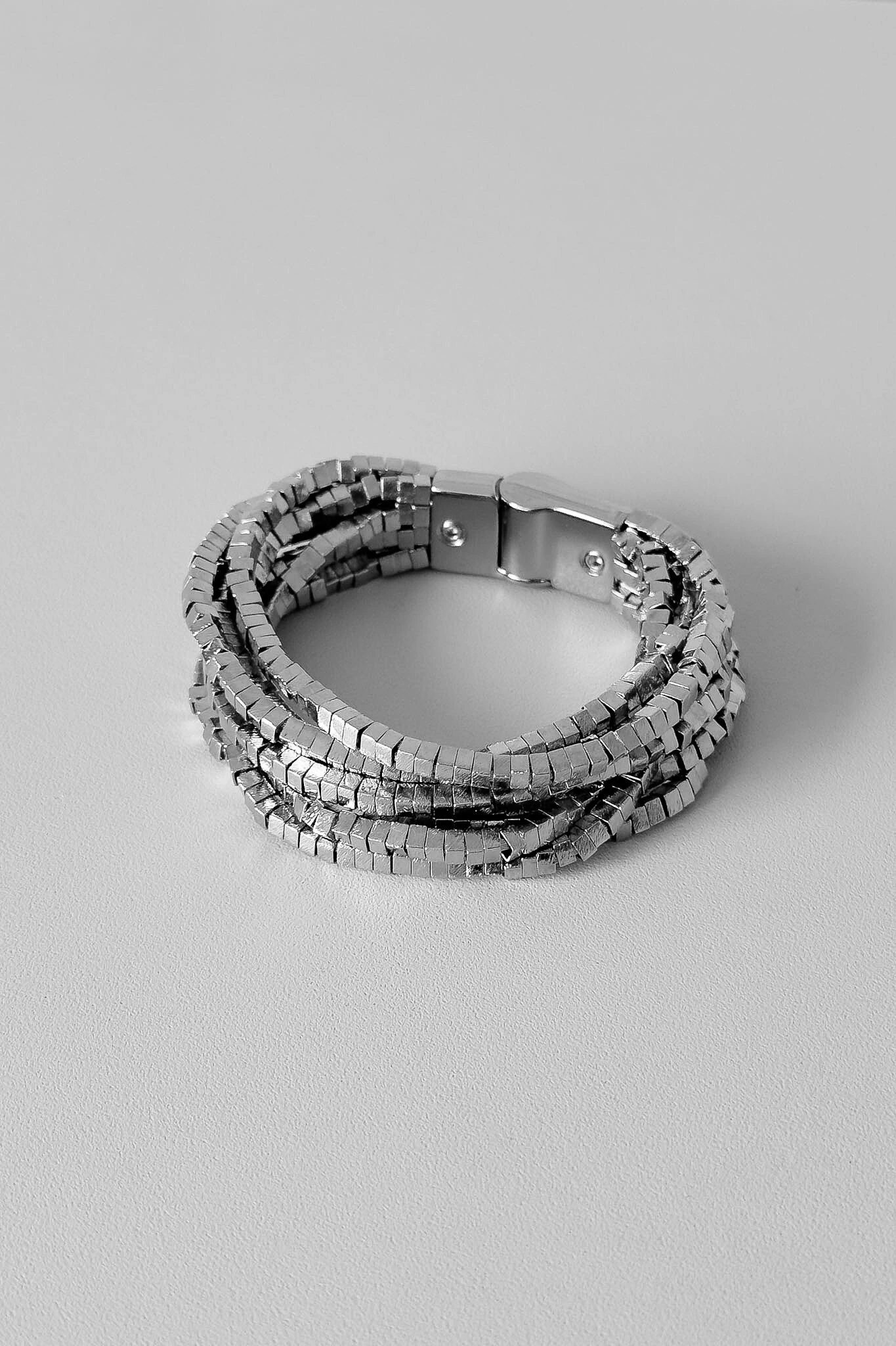 Design: 15 fios de cubinhos metálicos em múltiplas voltas